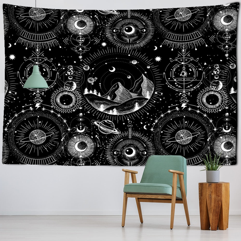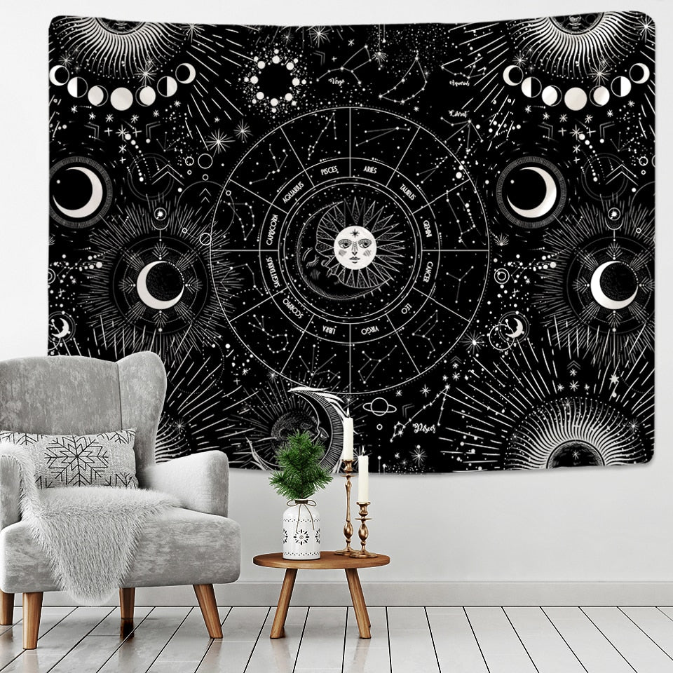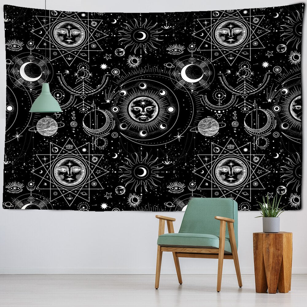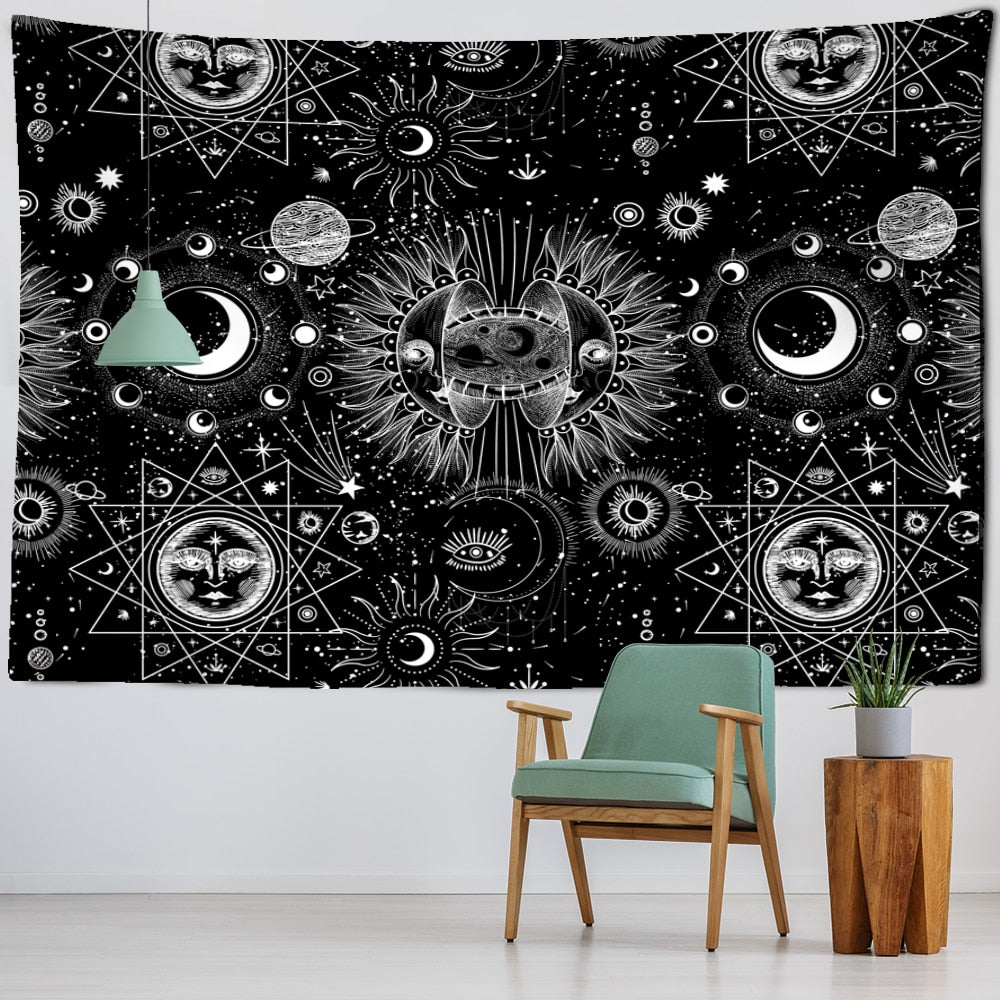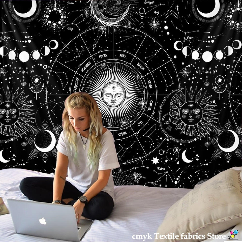White Black Sun Moon Mandala Starry Sky Tapestry Wall Hanging Bohemian Gypsy Psychedelic Tapiz Witchcraft Astrology Tapestry