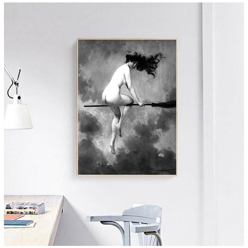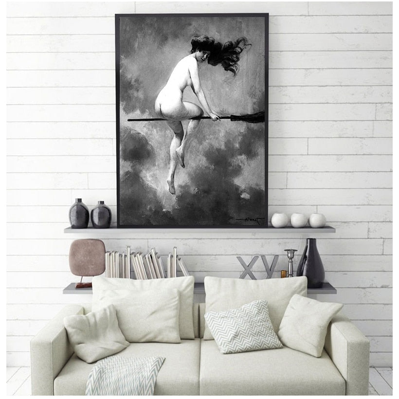 Witch Riding Broomstick Vintage Poster Wall Art Canvas Print Witch Broom Gothic Occult Halloween Antique Black White Painting