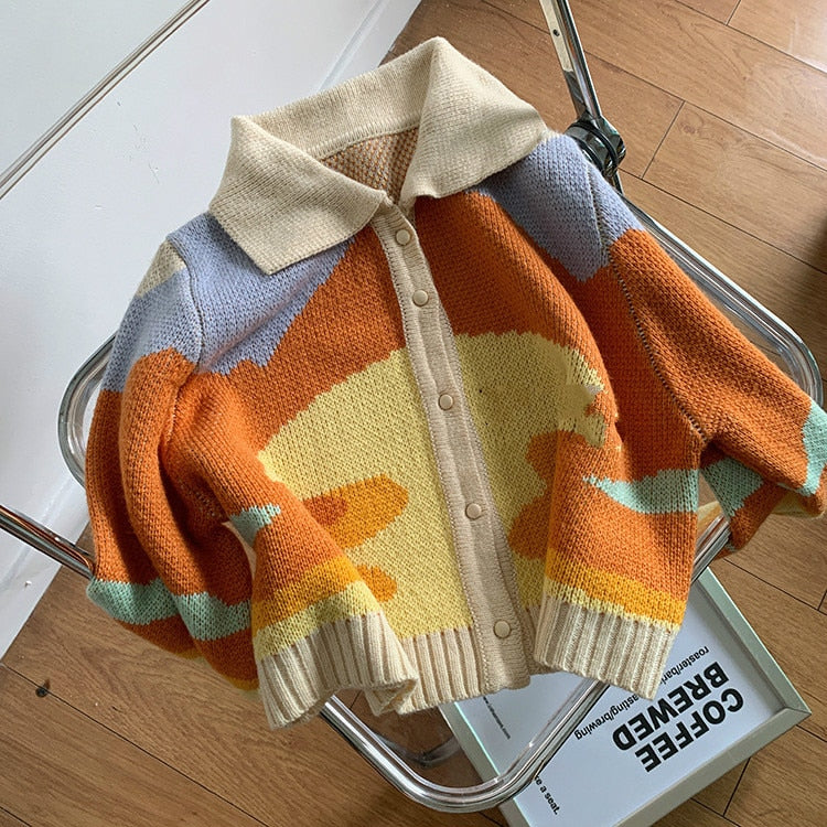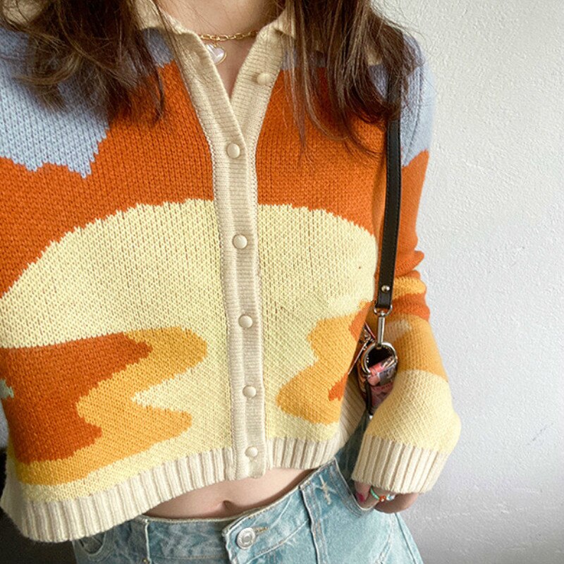 Women Autumn Vintage French Style Sunshine Print Short Knitted Sweater Chic Lady Fashion Single Breasted Loose Cardigans Femme