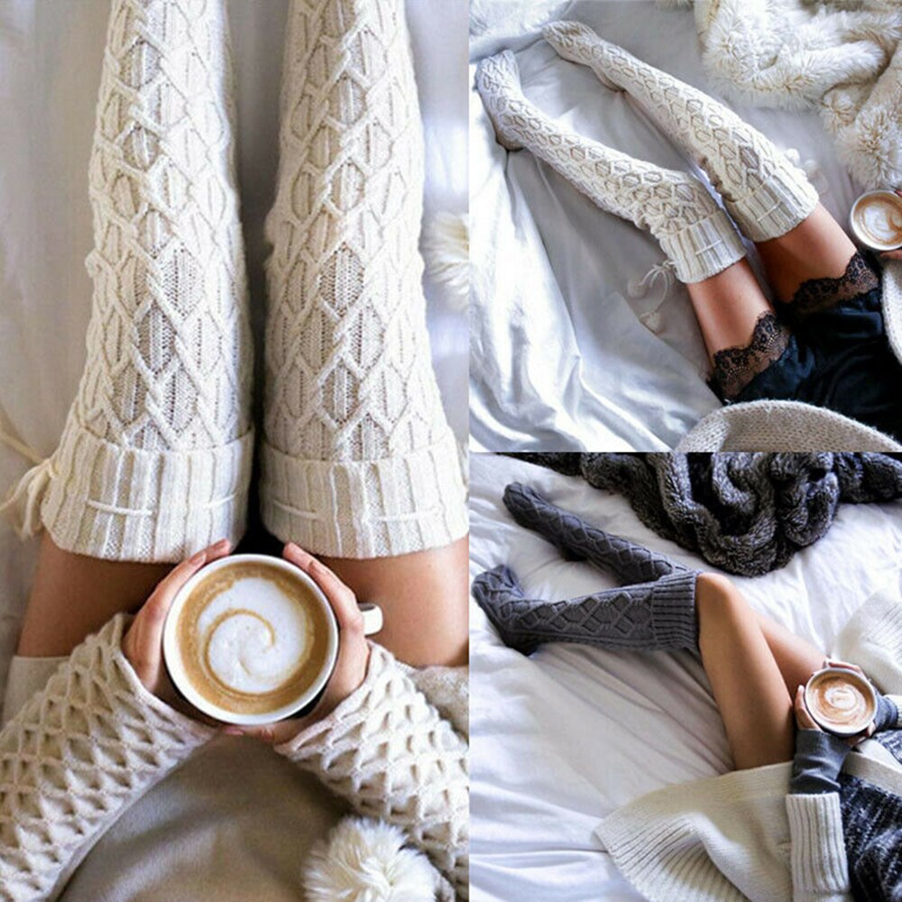 Women Winter Knitted Cotton Stocking Warm Thigh High Over the Knee Socks Fashion Twist Cable Crochet